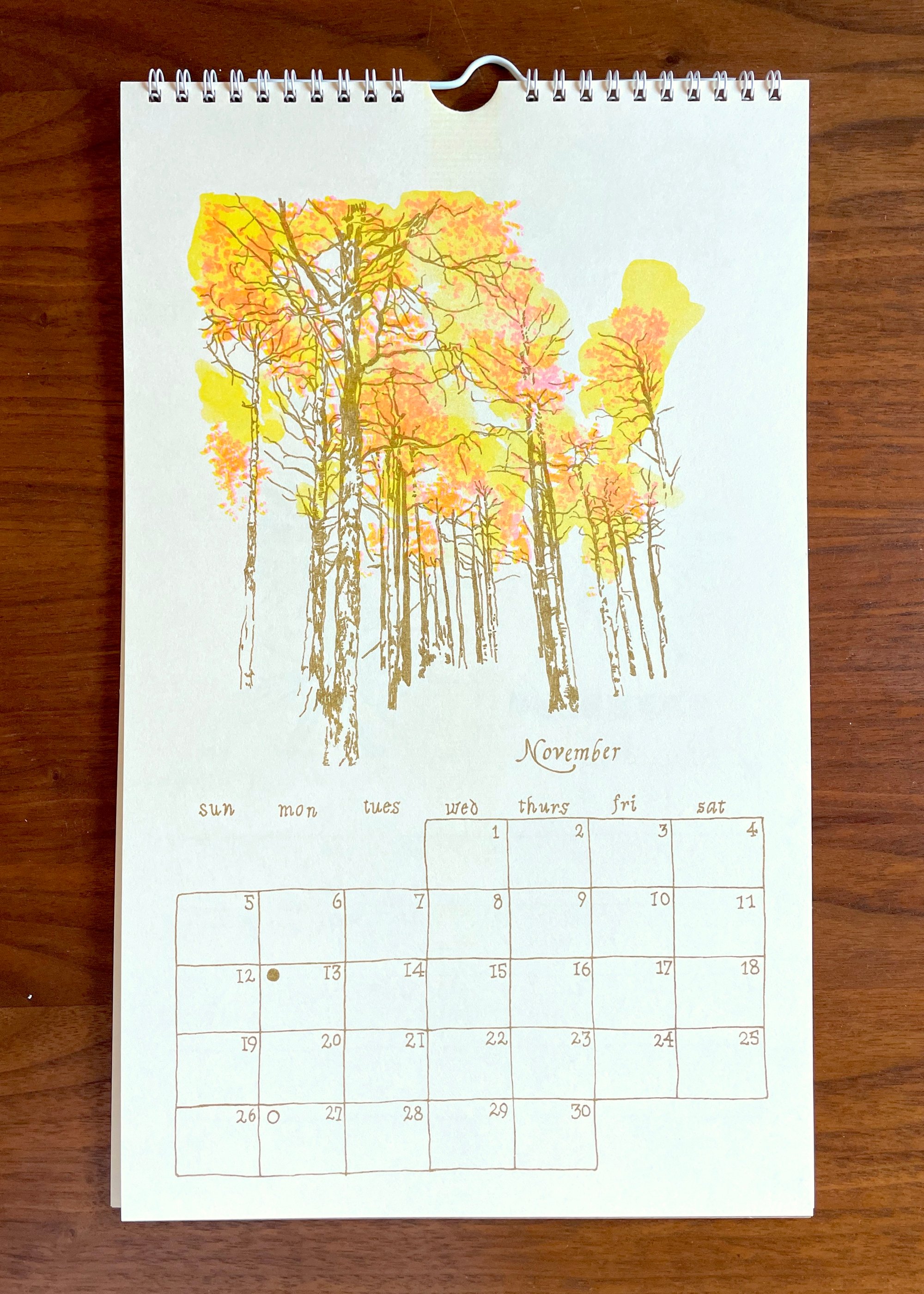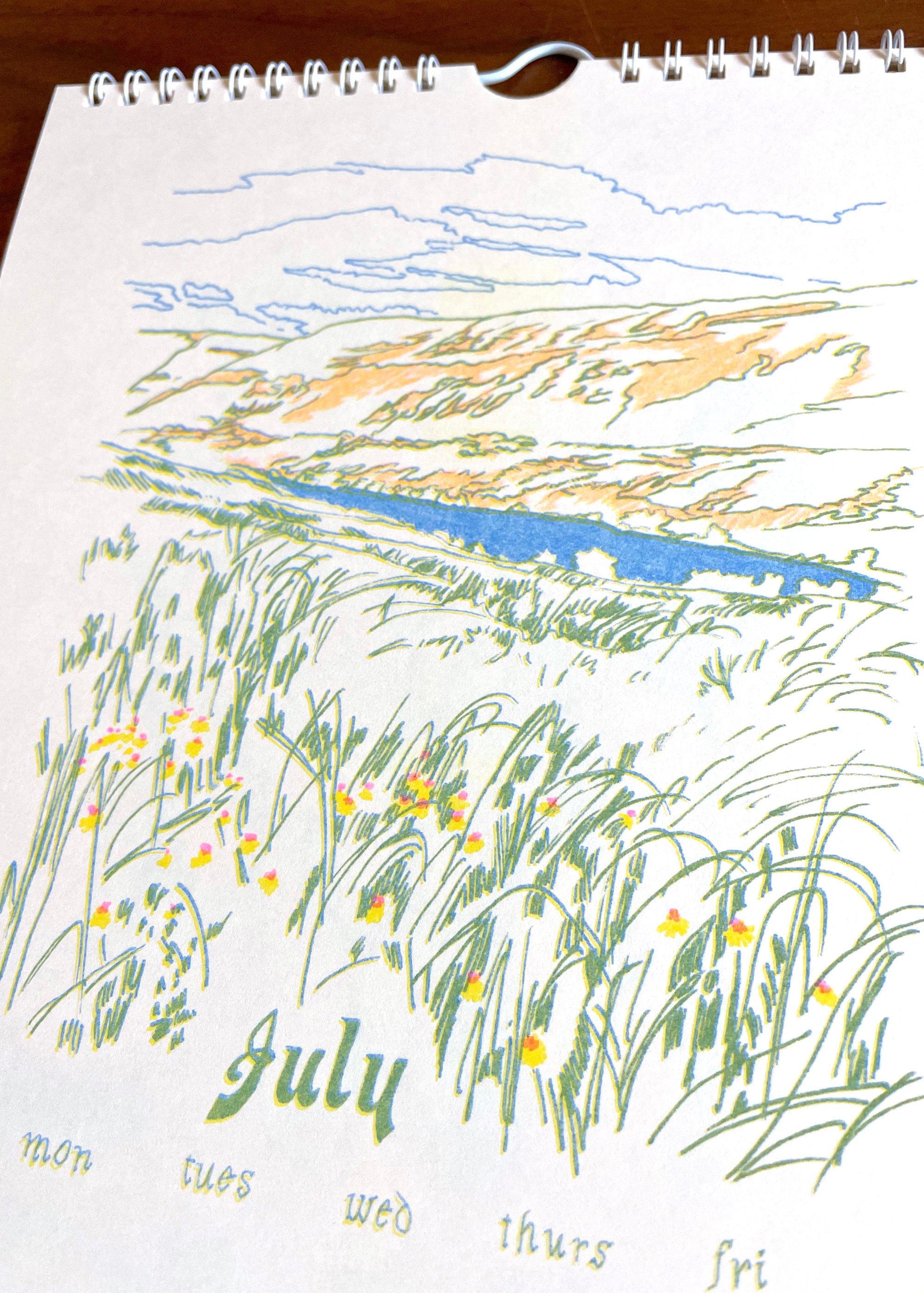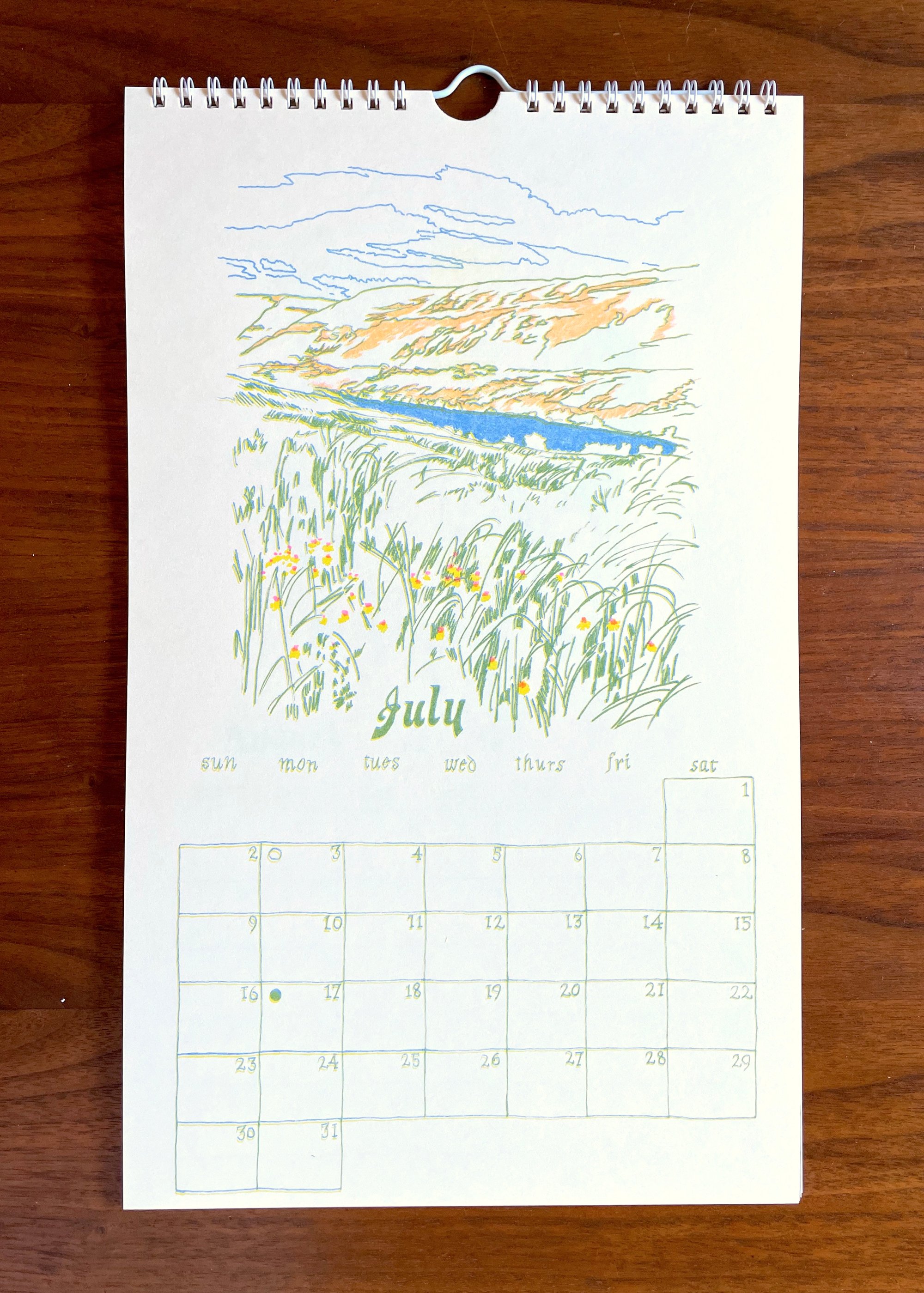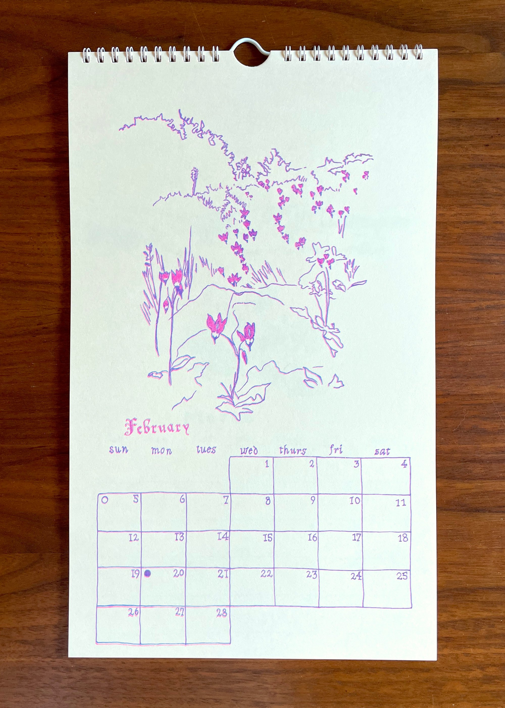 12 month wall calendar, risograph printed with Matt Katsaros in Berkeley, CA.