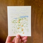 4 different landscape drawings with 2 alternate postcard backs. Printed on creamy off-white cardstock paper, 4.25 x 5.5 inches.